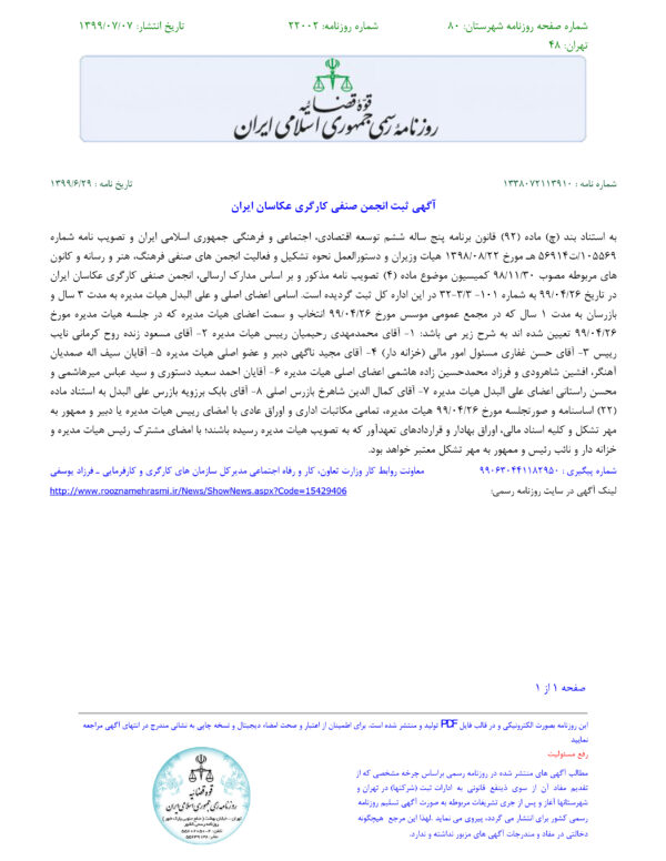 انجمن صنفی کارگری عکاسان ایران در تاریخ ۹۹/۰۴/۲۶ به شماره ۱۰۱-۳/۳-۳۲ در این اداره کل ثبت گردیده است. اسامی اعضای اصلی و علیالبدل هیات مدیره به مدت ۳ سال و بازرسان به مدت ۱ سال که در مجمع عمومی موسس مورخ ۹۹/۰۴/۲۶ انتخاب و سمت اعضای هیات مدیره که در جلسه هیات مدیره مورخ ۹۹/۰۴/۲۶ تعیین شدهاند به شرح زیر میباشد: